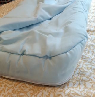Saco universal marca Nubeluna de piqué azul celeste. Destaca un pasacintas sobre el blanco que lleva un lazo de raso azul marino. El saco está compuesto por dos piezas, colchoneta y cubrepies, unidas por dos cremalleras, que permite usar solo la colchoneta o el saco completo. El cubrepies es desenfundable, una abertura en el interior permite retirar el relleno de fibra para un fácil lavado.