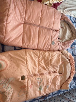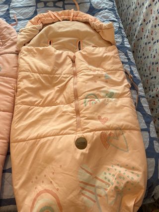 Dos sacos de invierno de la marca Tuc Tuc, ideales para carritos de bebé. - Saco rosa con estampado de estrellas blancas. - Saco coral con estampado de arcoíris y corazones. - Cierre de cremallera. - Acolchados y cómodos. se venden juntos y separados