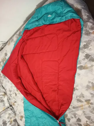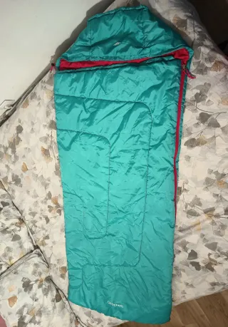 Saco de dormir junior de la marca Forclaz, ideal para temperaturas de hasta 10°. - Color verde azulado. - Cremallera lateral. - Capucha ajustable. no tengo la bolsa donde se guarda,se entrega tal como está en la foto Se ha usado un par de veces solo,está como nuevo