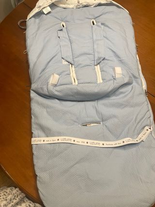 Saco de invierno Uzturre para silla de paseo, con un diseño acolchado y elegante. - Color azul claro. - Tejido suave y confortable. - Cintas con el logo de la marca Uzturre. - Etiqueta metálica con el nombre de la marca.