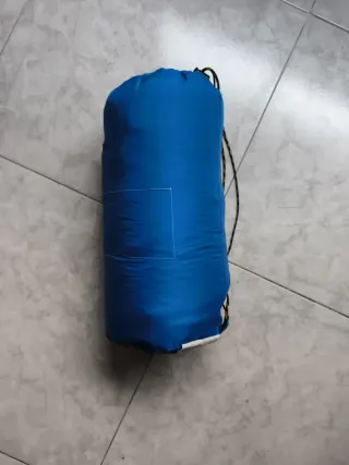 Saco de dormir de color azul, ideal para actividades al aire libre. - Exterior 100% nylon. - Interior 100% algodón. - Relleno Poliéster fibra hueca. Disponible 2 unidades. 12€ uno, 20€ los dos.