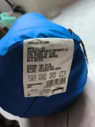 Saco de dormir de la marca Carrefour, ideal para noches templadas. Ligero,pesará 1.5 kg Incluye funda de transporte - Temperatura confort: 16°C - Dimensiones: 190 cm x 75 cm - Lavable a 30°C