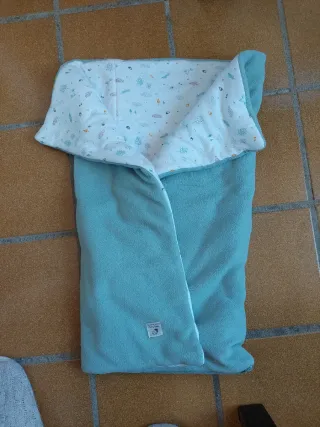 Saco para carro o cuna con un diseño reversible. - Exterior de color verde con textura. - Interior con estampado de cuadros. - Cierre con botones a presión en la parte superior. Cremallera para cierre. Se da con sábanas para minicuna o capazo Otoño/invierno. Apenas ha tenido uso