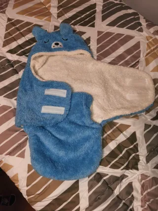 Saco para envolver al bebé con un diseño tierno de oso. - Color azul. - Material suave y cálido. - Capucha incorporada. - Cierre envolvente.