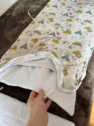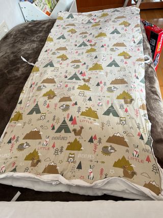 Saco para cuna con un divertido estampado de animales del bosque y elementos de aventura. - Diseño con tiendas de campaña, montañas, zorros, búhos y ardillas. - Tonos tierra y verdes que crean un ambiente acogedor. - Cierre con cremallera y cintas para asegurar. - Tejido suave y transpirable. -Saco 120g