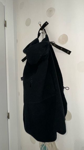 Saco de porteo en color negro, ideal para mantener al bebé abrigado. - Diseño con capucha. - Cierre con botones a presión.