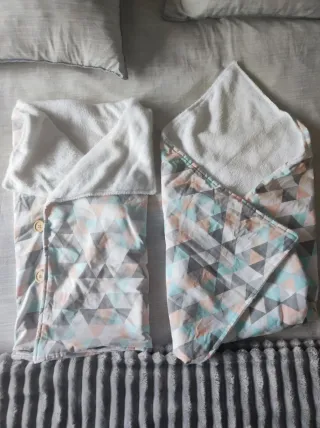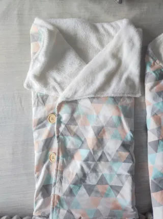 Saco y manta de bebe hechas a mano con tela de algodón y forrados con coralina blanca. Perfectos para capazo o minicuna