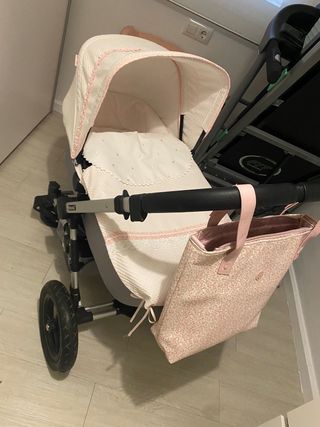 Saco y capota de silla de paseo Bugaboo Camaleón 3 marca La Giraffa Bianca e blu rosa palo en perfecto estado con juego para la barra pasito a pasito