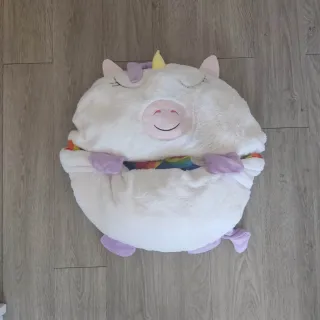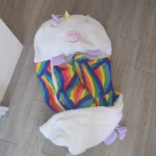 Saco de dormir infantil con un divertido diseño de unicornio y estampado de arcoíris. - Cierre con cremallera. - Orejas y cuerno de unicornio en relieve. - Patas de unicornio en la parte inferior. Sin uso, lo compré pequeño por error.