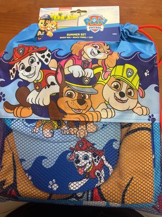 Conjunto de verano de la Patrulla Canina con bolsa, toalla y gorra. - Diseño con los personajes de la Patrulla Canina. - Bolsa tipo saco. - Toalla de playa. - Gorra.