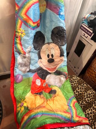 Saco de dormir infantil con diseño de Mickey Mouse y un alegre arcoíris. - Estampado de Mickey Mouse. - Diseño de arcoíris y flores. - Borde de color rojo.
