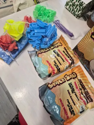 Set de arena mágica para jugar y crear. -1 saco de arena verde + 1 saco de arena azul. - Incluye varios moldes con formas y un recipiente hinchable para deposiyar la arena. - Diseñado para jugar en interiores.