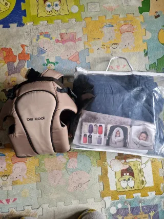 Conjunto de saco para bebé y mochila de porteo. - Saco de bebé en color azul - Mochila de porteo be cool en color beige.