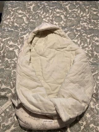 Saco Capucha Toile de Jouy Cream de Pasito a Pasito color crema Saco similar a un arrullo ideal para recién nacidos hasta los 6 meses. Muy poco uso y lo enviamos con su funda protectora original. Precio original en tienda oficial 58 euros.