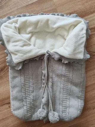 Saco de bebé de punto gris, ideal para capazo o carrito. Cuenta con un forro interior suave y cálido. - Diseño de punto trenzado. - Forro interior de tejido polar. - Cierre con cremallera. Pompones decorativos. Muy poco uso. Comprado de tienda Bayon por 50€