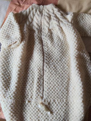 Precioso saco de lana tejido a mano, ideal para mantener abrigado al bebé. Su diseño artesanal le da un toque único y especial. - Tejido de lana de alta calidad. - Diseño con trenzas y textura. - Cierre de cremallera. - Detalle de lazo en la parte inferior.