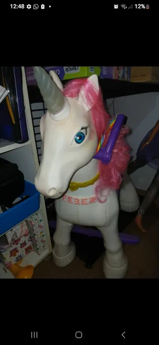 Precioso unicornio de batería de las youtubers las ratitas pandilleras. Lleva mucho pienso parado por lo que hay que revisar la batería y poner pilas al cuerno que luego da luz de colores y música. Es Precioso y a las niñas les encanta.