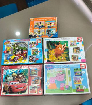 Lote de 5 puzzles progresivos infantiles de diferentes personajes. - 1 Puzzle Ravensburger de Minions (4 en 1). - 1 Puzzle Educa de Mickey y sus amigos. - 1 Puzzle Educa de El Rey León. - 1 Puzzle Educa de Cars. - 1 Puzzle Educa de Peppa Pig.