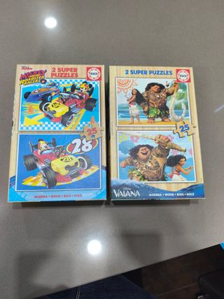 Pack de dos puzzles de madera de la marca Educa. - Puzzle de Mickey y los Roadster Racers con 28 piezas. - Puzzle de Vaiana con 25 piezas. - Material: Madera.