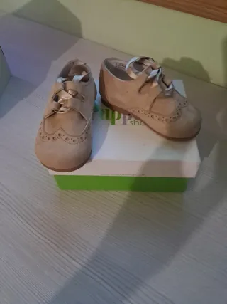 Preciosos zapatitos de vestir para bebé en color camel, perfectos para ocasiones especiales. - Diseño clásico con detalles troquelados. - Cierre con cordones de raso. - Material suave al tacto.