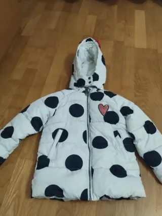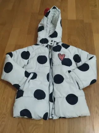 Abrigo de Orchestra talla 4 años. Blanco con lunares negros, acolchado y forrado de pelito blanco. Cierre con cremallera y corchetes en la capucha. Lazo rojo decorativo en la capucha, y corazón brillante en la parte delantera. Precioso, muy abrigado e impecable.