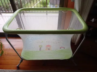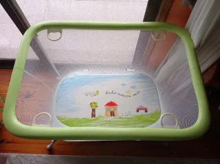 Parque infantil de malla con estructura plegable y diseño divertido. - Estructura metálica. - Laterales de malla transpirable. - Diseño estampado con casa, árbol y coche. - Asas de sujeción interiores. - Nuevo casi sin uso