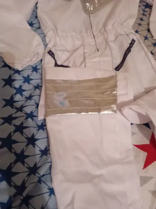 Disfraz de astronauta para niños, ideal para fiestas o juegos. - Traje blanco con detalles plateados. - Incluye casco. - Parches temáticos. Tiene un poco de azul en una de las rodillas que se cayó el niño en el patio..