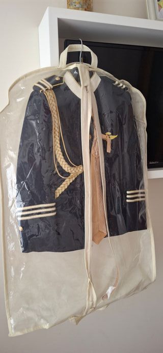 Traje de comunión para niño, modelo Alfa 3, talla 8. Completo - Chaqueta azul marino con detalles dorados. - Pantalón beige talla 7 - Chaleco beige. - Camisa blanca. - Corbata a juego. - zapatos talla 37
