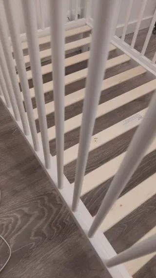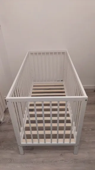 Cuna de bebé de color blanco, con somier de lamas de madera. Esta sin marcas de uso. - Medidas: 120x60 cm. - Estructura de madera. - Barreras de seguridad.