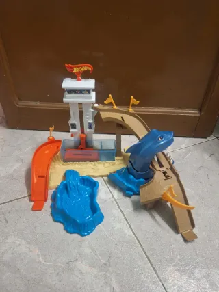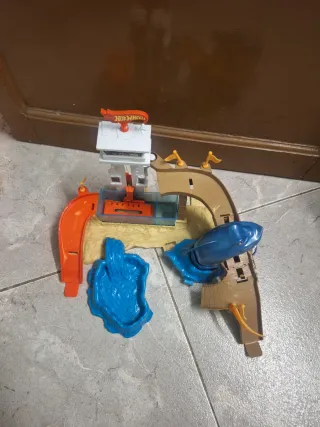 Pista de juegos Hot Wheels con accesorios. - Incluye rampa naranja. - Zona de agua azul. - Elementos de pista color arena. - Señal Hot Wheels.