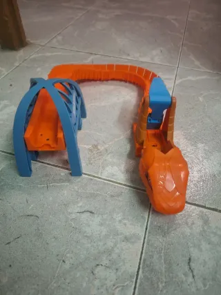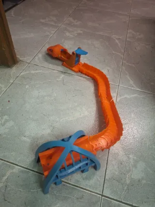 Pista de juego Hot Wheels con diseño de serpiente. - Incluye tramo de pista naranja. - Pieza de entrada/salida azul con forma de túnel. - Cabeza de serpiente naranja con detalles.