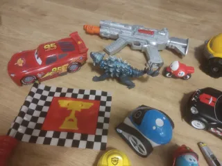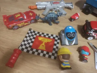 Lote 1 de 10 juguetes para niños. - Coche rojo tipo Rayo McQueen con número 95, funciona a pilas con la bandera. - Figura de dinosaurio azul. - Pistola plateada con detalles naranjas. - Robot azul con ruedas. - Coche negro y rojo teledirigido sin mando. - Figura de bombero. - Figura de trabajador con casco amarillo. - Moto pequeña. - Camion de obra. - Avión. Precio negociable.