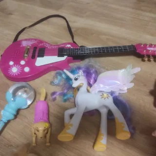 Lote 3 variado de 10 juguetes para niña. - Guitarra rosa eléctrica a pilas. - Unicornio con alas. - Muñeca Patchy Dolly. - Bolsa accesorios imán para la muñeca. - Varita mágica Frozen. - Muñeca pequeña. - Figura de doctora. - Maletín con varios puzzles. - Figura de perro. - Figura de conejo. Precio negociable.