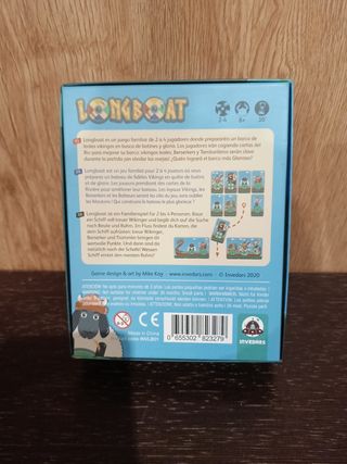 Juego de mesa Longboat diseñado por Mike Kay. - Ilustraciones de vikingos y un dragón. - Incluye el logo de Invedars.