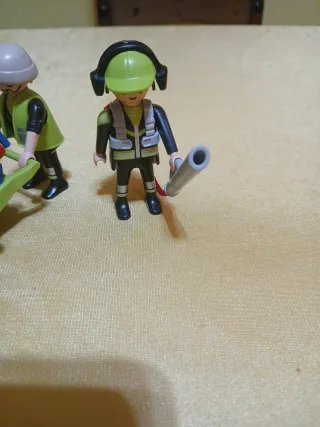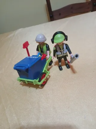 Set de figuras Playmobil con temática de bomberos y personal de limpieza urbana. Incluye dos muñecos y un carrito de basura. - Figura de bombero con casco verde y equipo. - Figura de trabajador con casco blanco y chaleco. - Carrito de basura azul con ruedas rojas y escoba. ENVIOS A PARTIR DE 20€ DE COMPRA AGRUPA VARIOS ANUNCIOS