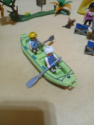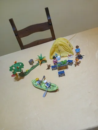 Set de camping de Playmobil con figuras y accesorios. - Incluye tienda de campaña amarilla. - Barco con dos figuras y remos. - Figuras de personas y perro. - Accesorios de camping como mesa, sillas y barbacoa. - Elementos de paisaje como árbol y plantas. ENVIOS A PARTIR DE 20€ DE COMPRA AGRUPA VARIOS ANUNCIOS