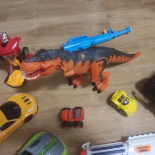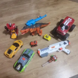 Lote de juguetes variados para niños. - Coche amarillo pequeño. - Coche rojo pequeño. - Coche deportivo gris y verde. - Coche todoterreno rojo. - Coche deportivo amarillo. - Dinosaurio naranja y negro ojos luces y rujidos. - 2 Pistolas juguetes. - Coche transformer. Precio negociable.