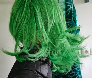 Disfraz del personaje Asco de la película Inside Out. - Color verde esmeralda. - Estampado de flores blancas. - cinturón, Peluca verde, calcetines altos y pañuelo lila del cuello.