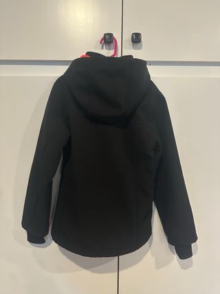 Chaqueta negra para niña de la talla 8 años. Perfecta para actividades al aire libre. - Material softshell. - Forro interior de color fucsia. - Cremalleras en los bolsillos laterales.