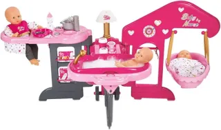Complejo de juego Smoby La casa de los bebés para cuidar muñecos. - Incluye cuna, bañera con ducha y trona. - Accesorios de alimentación y aseo. - Estructura de plástico resistente en tonos rosa y gris.