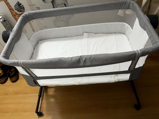 Cuna colecho con estructura de madera y laterales de tela blanca. - Laterales de malla transpirable. - Base del colchón perforada. - Ruedas para facilitar el movimiento.