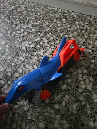 Hot wheels Divertido coche con diseño de tiburón en llamativos colores azul y naranja. - Ruedas naranjas. - Base naranja.