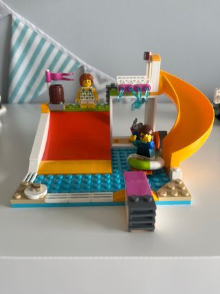 Set de construcción LEGO Friends Parque Acuático. A partir de 7 años. - Incluye tobogán y zona de juegos. - 2 Figuras de personajes LEGO Friends. - Accesorios temáticos de parque acuático. - 132 piezas - Sin caja pero con instrucciones.