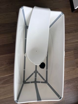Bañera plegable Stokke Flexi Bath, ideal para ahorrar espacio. - Diseño blanco. - Bordes reforzados en gris. - Incluye tapón de drenaje. PESTAÑA CIERRE ROTA. Ver foto.