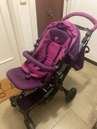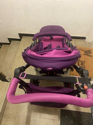 Cochecito Jane Rider en color morado y fucsia, ideal para paseos cómodos. - Incluye silla de paseo y capazo. - Capota y arnés de seguridad. - Ruedas todoterreno.