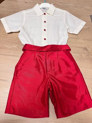 Elegante conjunto para niño, ideal para celebraciones. - Camisa blanca satinada con cuello Peter Pan y botones granates. - Pantalón corto rojo con cinturón a juego.