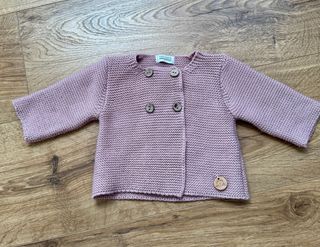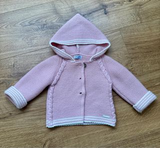 Preciosa chaqueta de punto rosa de la marca Pangasa para bebé. Confeccionada con un suave tejido y un diseño encantador. - Capucha incorporada. - Cierre de botones. - Puños y bajo con detalles de canalé y rayas blancas. - Adorno de trenzado en los laterales. Talla: 3 meses