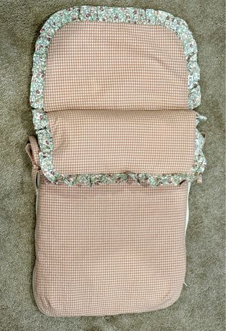 Conjunto de saco para capazo universal y bolso a juego. - Diseño a cuadros vichy en tono rosa. - Ribete con estampado floral y volante. - Relleno extraíble.
