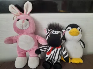 Conjunto de tres adorables peluches, perfectos para los más pequeños. Incluye un tierno conejo rosa, una simpática cebra y un simpático pingüino. - Peluche de conejo rosa con detalles blancos. - Peluche de cebra con rayas blancas y negras y bufanda roja. - Peluche de pingüino blanco y negro con pico amarillo.