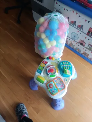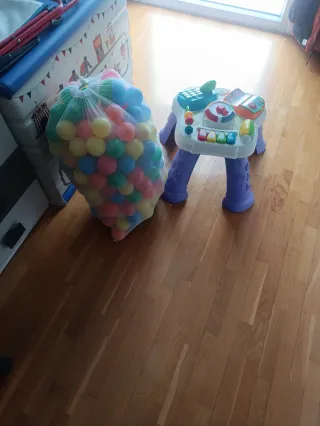 Se vende mesa de actividades para bebés y una bolsa llena de bolas de colores. - Mesa de actividades interactiva. - Bolsa de malla con bolas de plástico de varios colores.